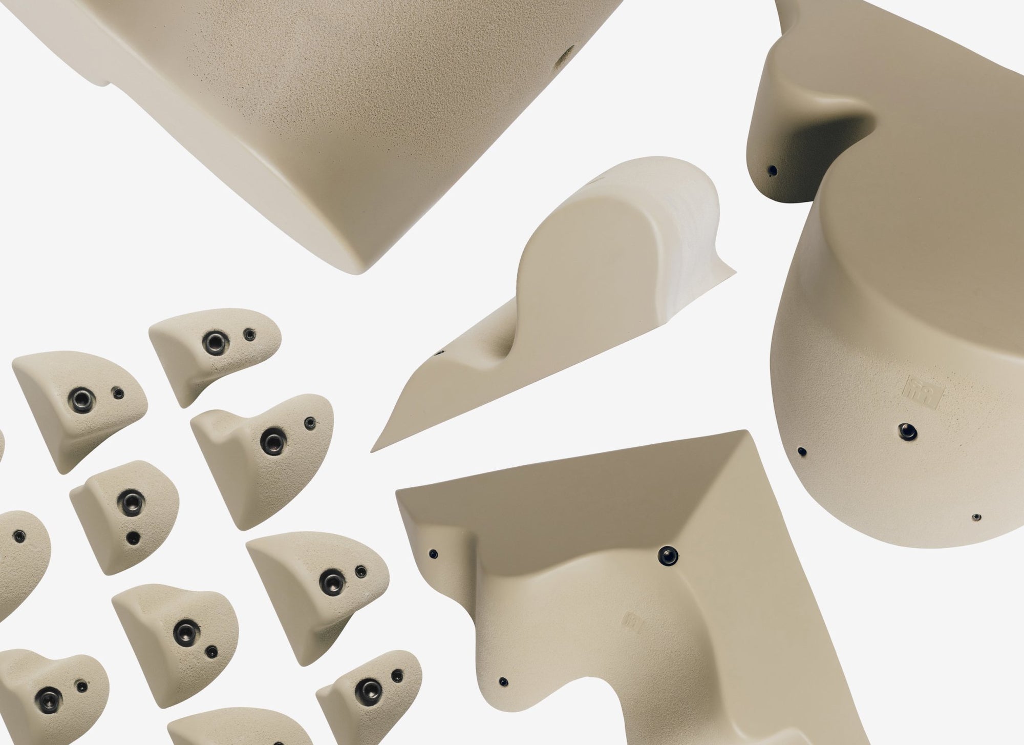 Barrel slopers, rails, rolling slots, and multiple styles of pinches define the family, along with a new approach to dual-texture. Instead of sharp contrast, the surface fades smoothly from slick to textured, creating subtle transitions that challenge grip & body position, even on the simplest routes.