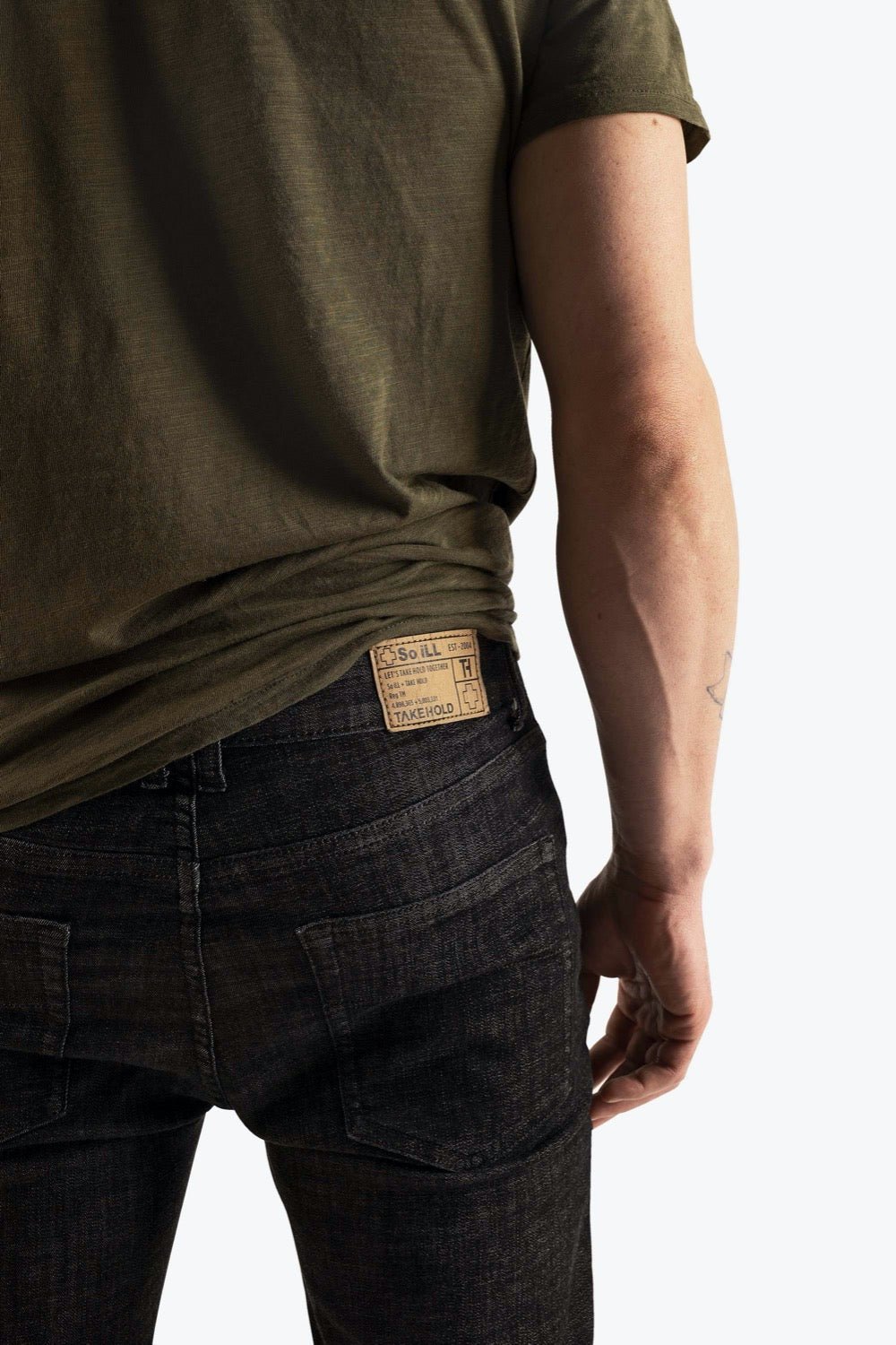 Antique silver metalwork combines with a traditional five pocket build and vintage black wash for an exceptional design.